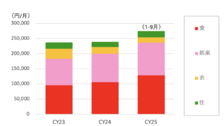 データが出揃ったので、2025年1-9月に「何にいくら使ったか」をまとめてみます。<2025年1-9月の個人支出実績>※「家族」は家族関係支出の私負担分、「個人」は純粋な個人支出分です。月額(円)家族個人合計%食102,50325,6721...