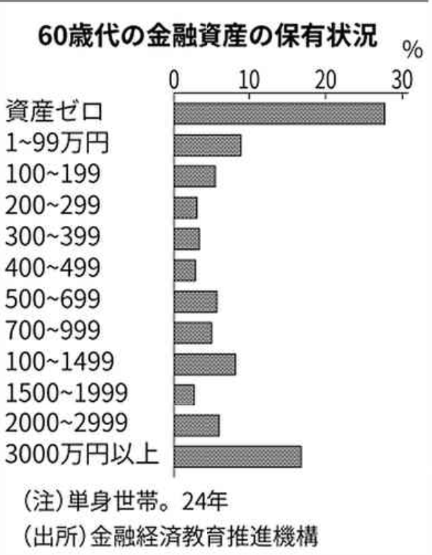 60歳代の単身世帯のうち金融資産ゼロは27.7%あり、ゼロを含む200万円未満は42%と12年比7%増だった。一方、3000万円以上の資産を持つ世帯の割合は16.8%と0.3%増えた。