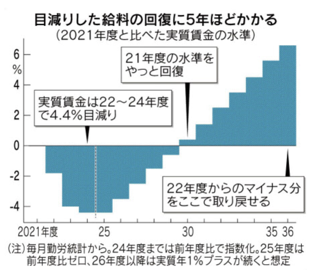 「2022年度以降のインフレ局面で日本の実質賃金の累計の落ち込みが3年で4%超と、リーマン・ショック時に近い下げ幅になっている。24、25年と続いた5%を超える歴史的な賃上げでも物価の伸びには追いつかず、サラリーマンらの給与は目減りしている。」
