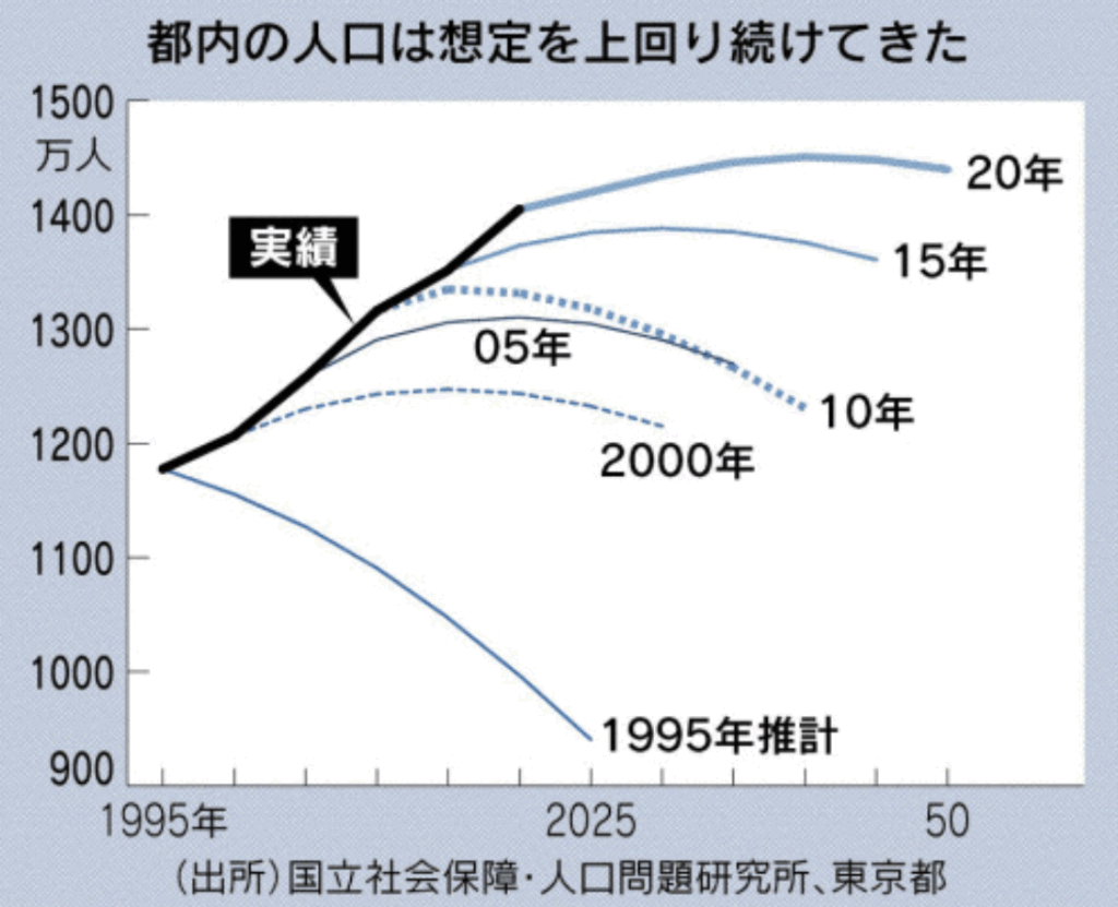 参考になりそうなのは、過去の「都内人口」の予測と実績の履歴です。