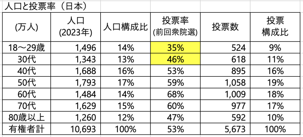 また、今の日本の年代別の「人口構成」と「投票率」はどうなっているのかというと、