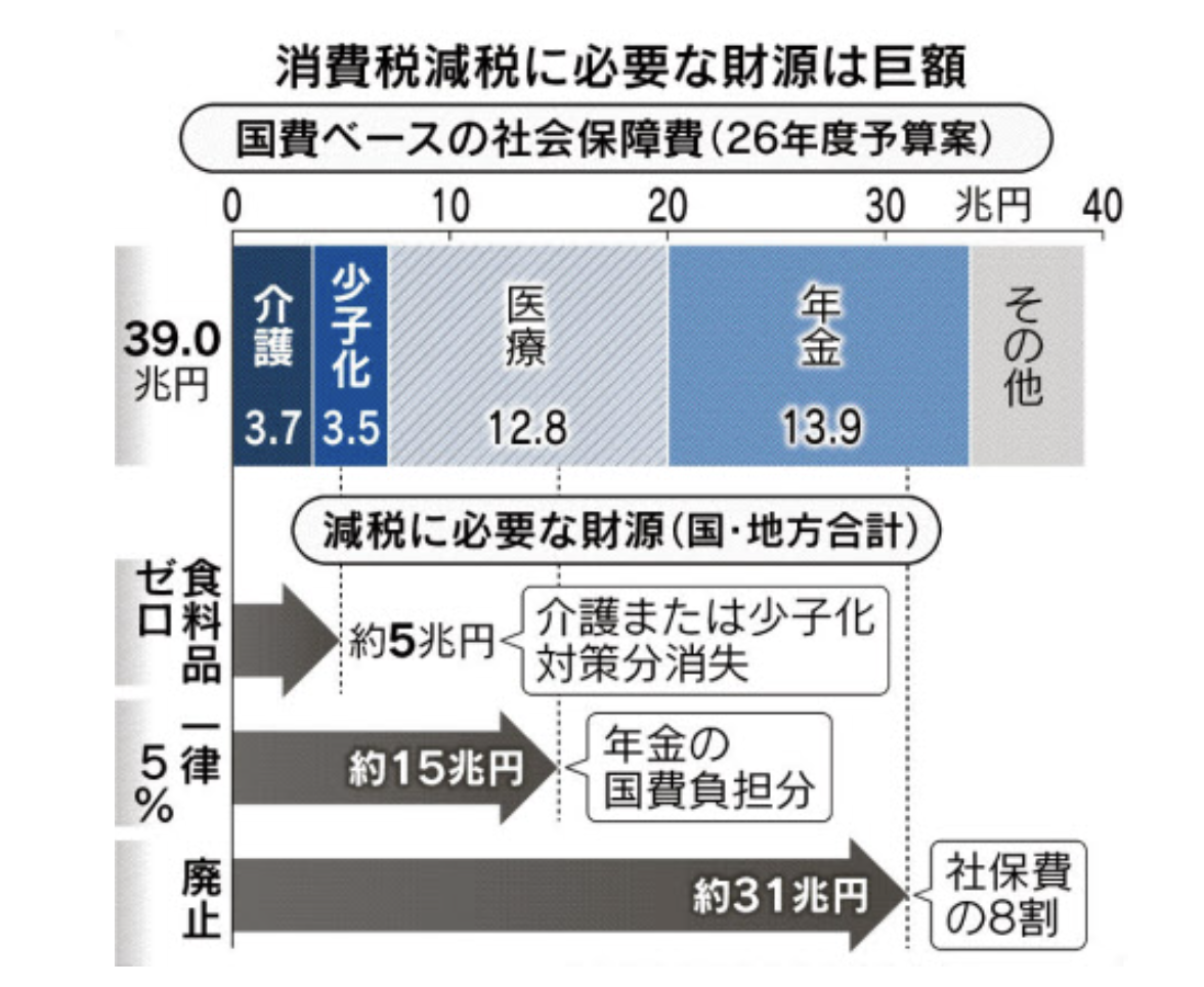 日経新聞朝刊2026年2月2日に「国費の社会保障負担と消費減税のインパクト」の図表が掲載されてました。仮に「食料品消費税ゼロ」が実現すると「年5兆円」の税収・財源減だそうです。