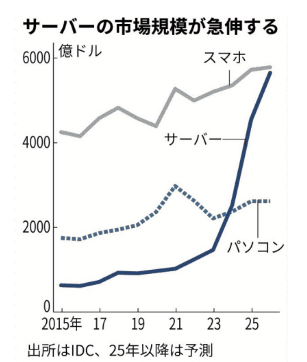 「米調査会社IDCの推計によると、23年に1473億ドルだったサーバー市場は24年に前年比70%増、25年に80%増と高成長を続け、26年には5659億ドルに達する見通し。デジタル機器で最大のスマホ市場(26年予測で5788億ドル)と同水準の規模となる。