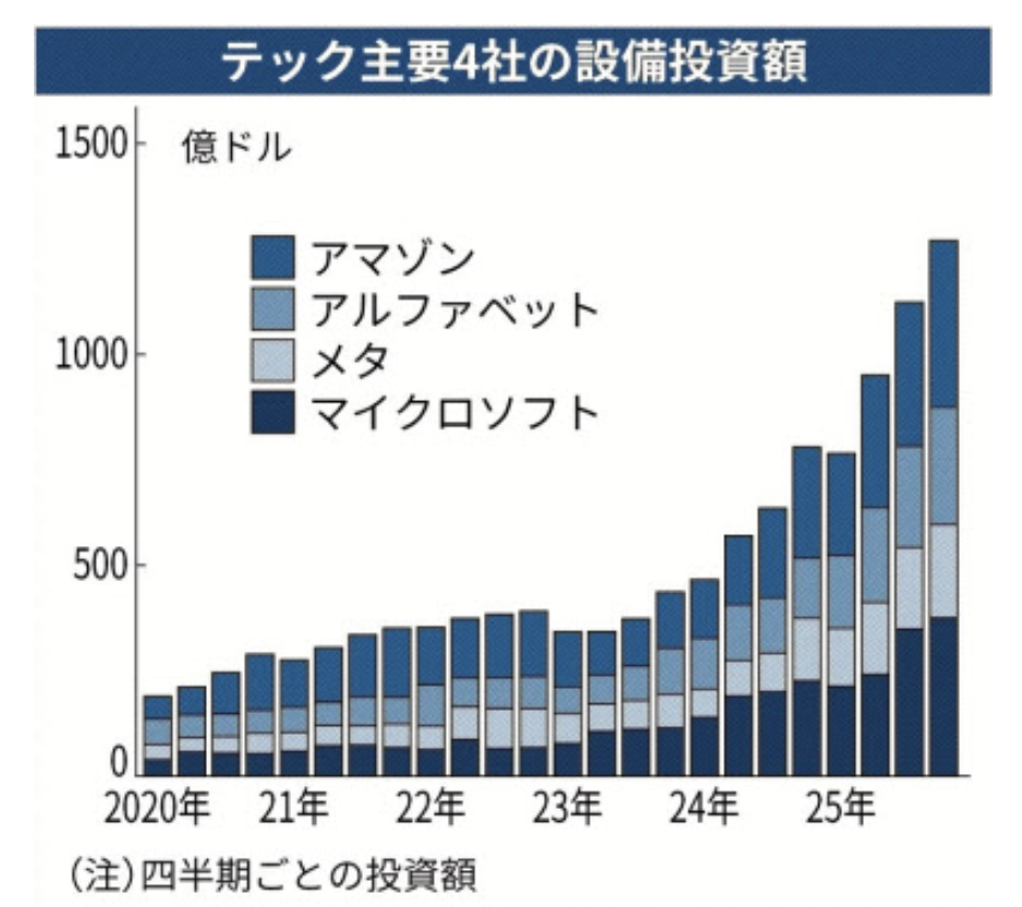 そして、その半導体をバカみたいに高い値段で買ってるのが、米大手テック企業なわけです。彼らの「設備投資」のトレンドも別日の日経に掲載されてました。2026年は「100兆円」だそうです。