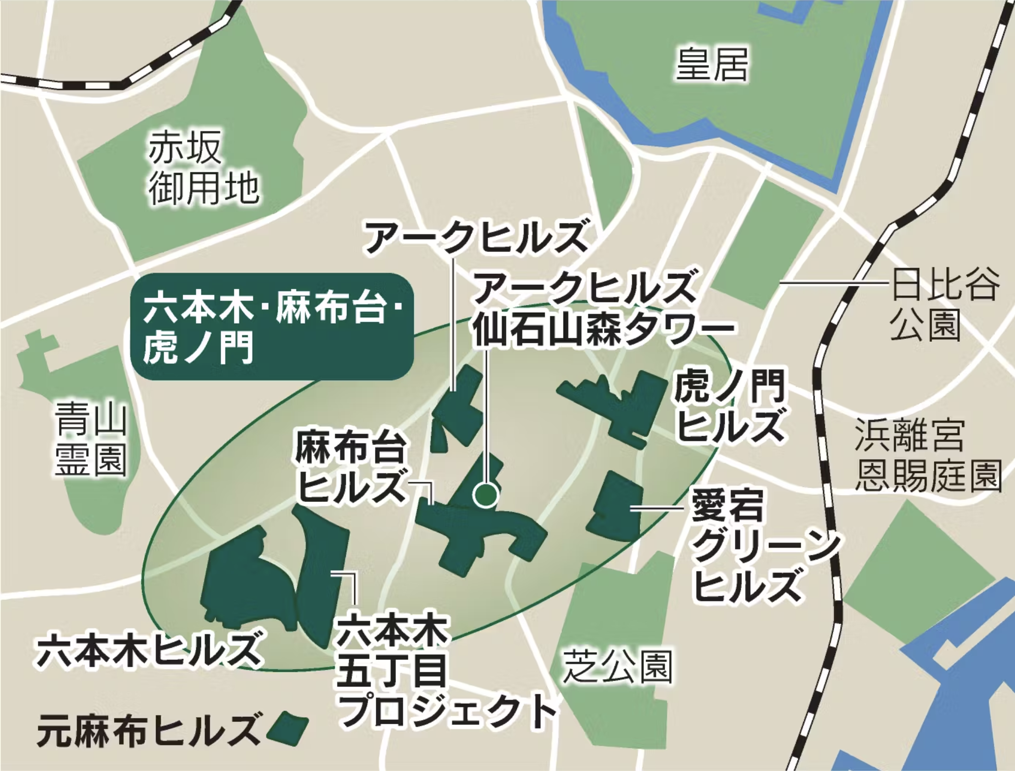 「東京都心で緑が増え続ける一帯がある。森ビルが再開発を手がける港区の六本木や麻布台、虎ノ門のエリアだ。3月に開業40年を迎えるアークヒルズ以降の大型再開発は全体の3分の1を緑で覆い、その面積は12ヘクタールに及ぶ。2030年度の完成を目指す「六本木五丁目プロジェクト」では約1.6ヘクタールの森を整備、地域全体の魅力を高める。