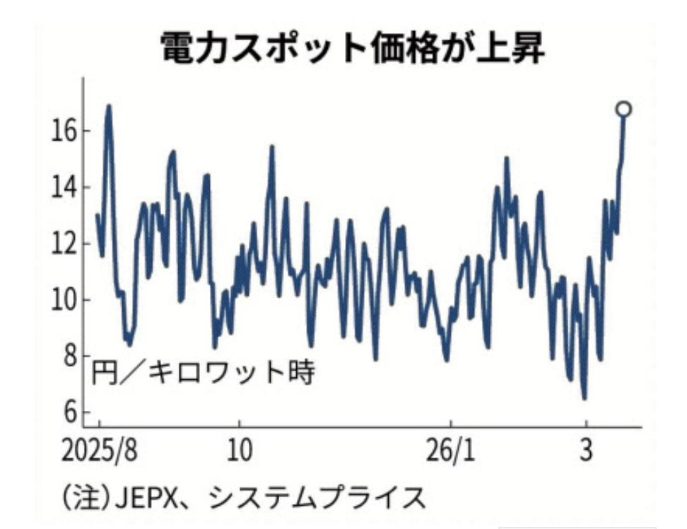 「中東情勢激化が電力市場を揺らしている。新電力などが電力調達に利用する日本卸電力取引所(JEPX)のスポット価格は、米国・イスラエルによるイラン攻撃が開始された2月末比で2倍超に上昇した。液化天然ガス(LNG)価格の高騰が波及した。市場連動型の電力料金契約を結んでいる企業や一般家庭には、電気代上昇の影響が即時に及ぶ。