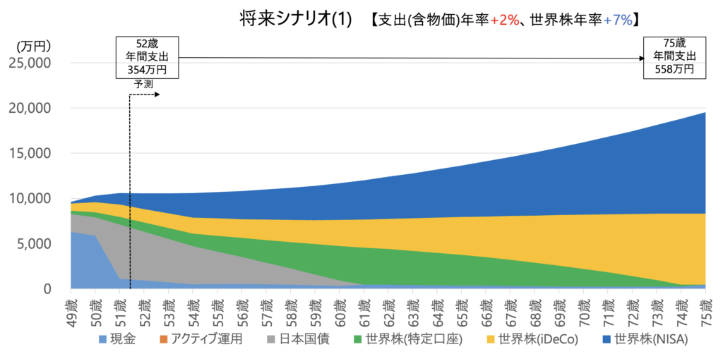 将来シナリオ(1)は、「支出(物価含む)」が年率+2%、世界株が年率+7%の前提で、この場合75歳まで金融資産が右肩上がりで、メルヘンな将来になります。これは前回と大勢に変化無しです。