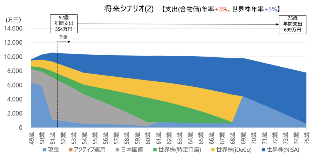 将来シナリオ(2)は、「支出」が年率+3%、世界株が年率+5%の前提で、この場合75歳時点での金融資産残高は約7800万円と老後資金としては十分で、ただ前回想定よりは800万円下振れです。
