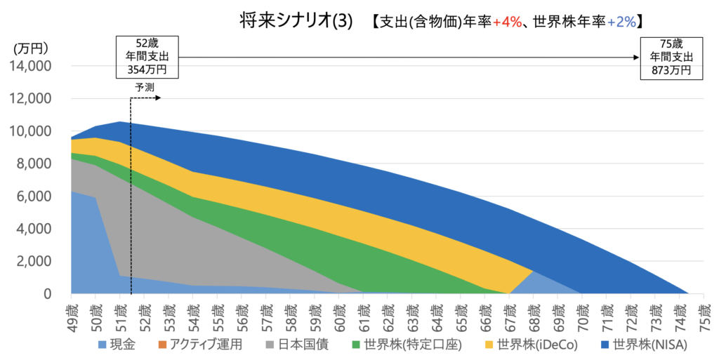 将来シナリオ(3)は、「支出」が年率+4%、世界株が年率+2%の前提で、この場合74歳時点での金融残高はほぼゼロで「Die with Zero」に近い状態になります。前回より「1年」早い枯渇です。