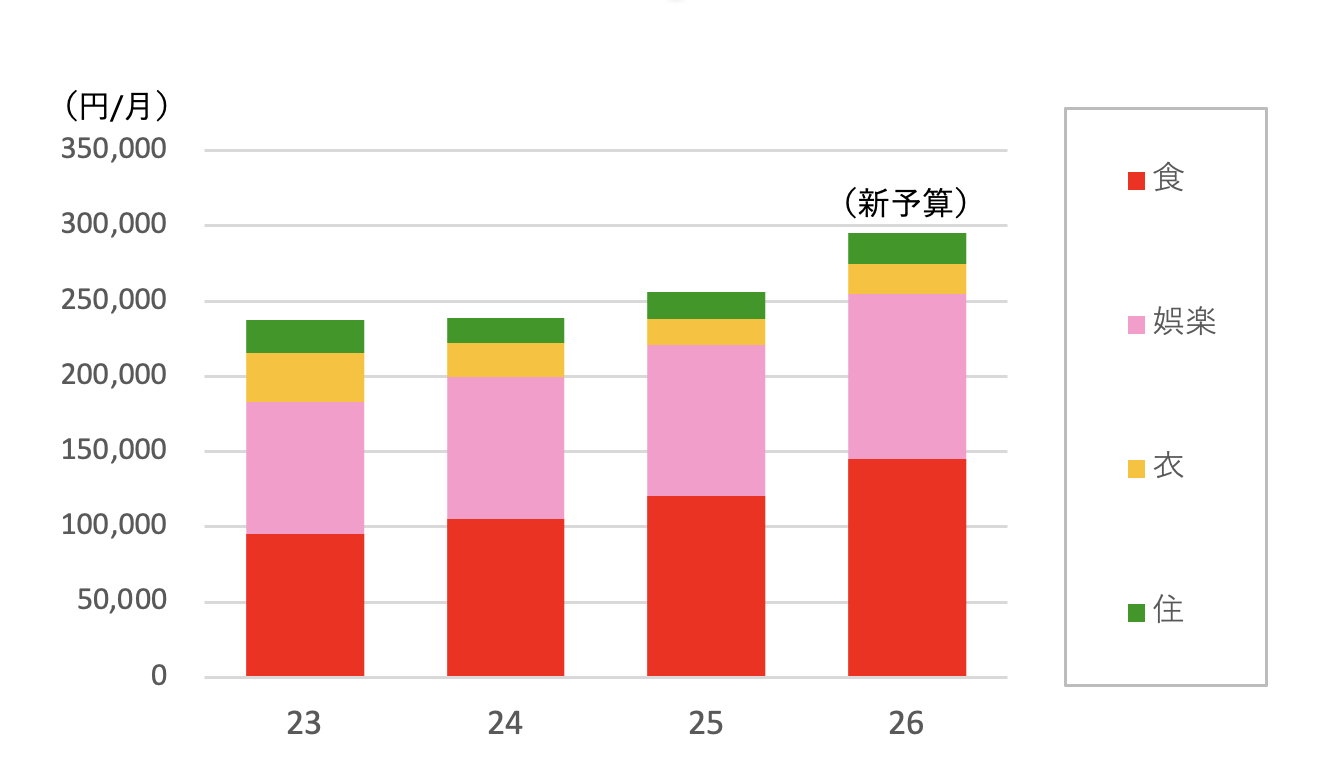 主に「食」に関するライフスタイルの変化を織り込みました。このあたりの支出水準に今のコンフォートゾーンがあるのではないかと推定してます。「食」「娯楽」によりフォーカスする予算です。